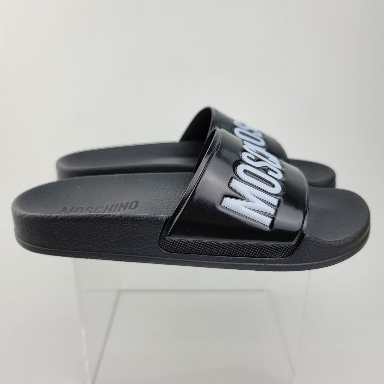 NWOT Moschino Pool Slides Black With Embossed White Logo