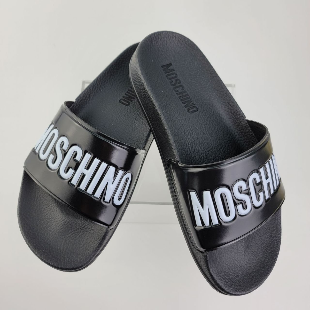 Be the first to review “Moschino Pool Slides Black With Embossed White Logo”