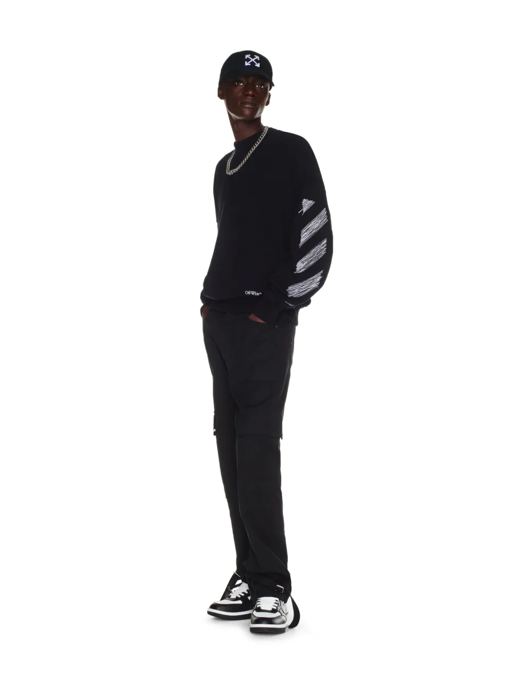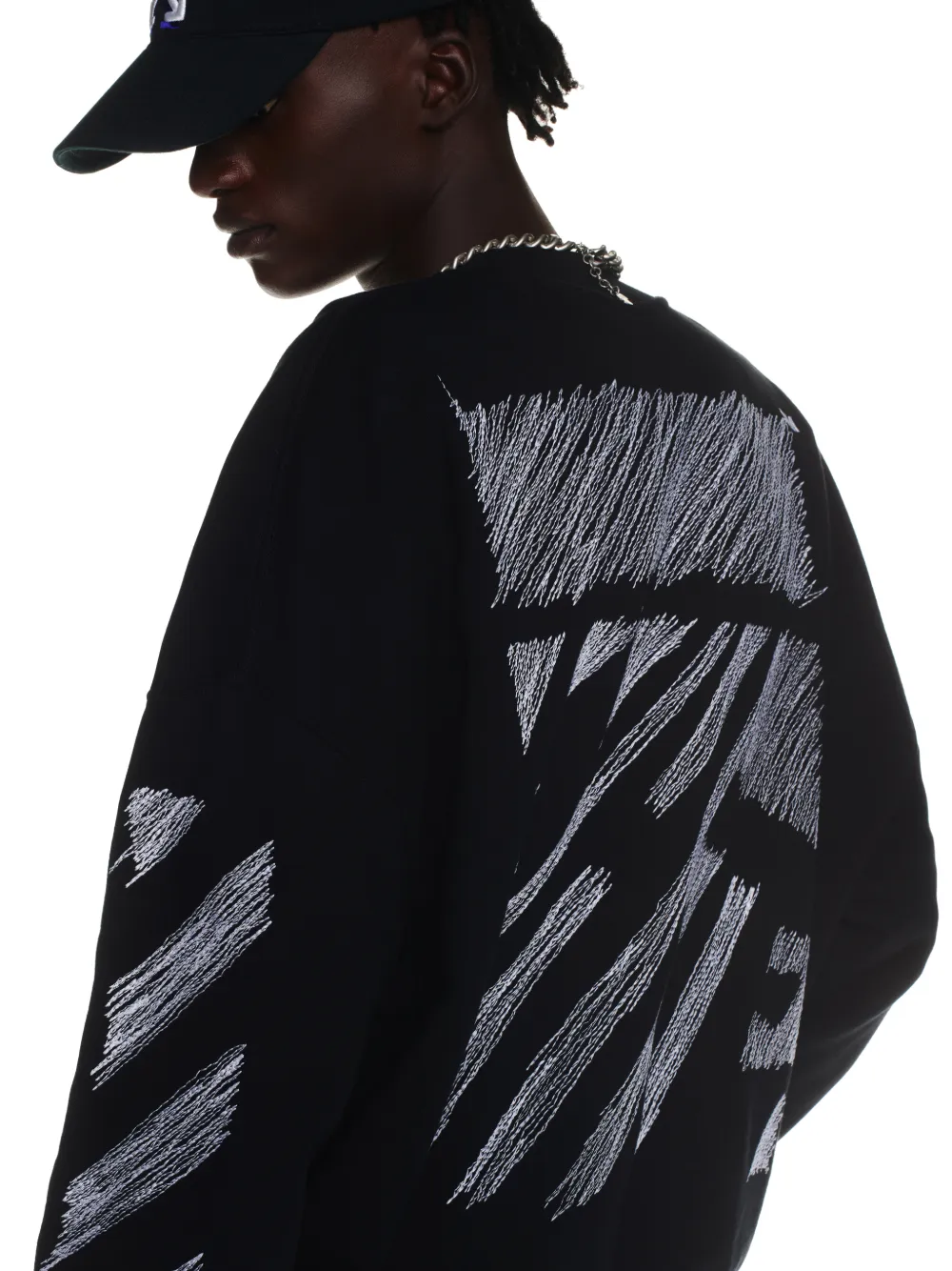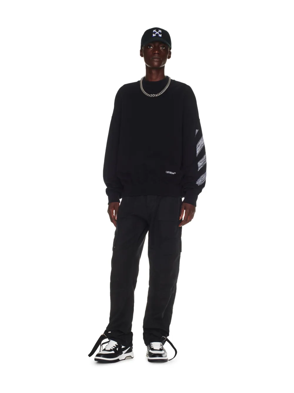 Black Long Sleeves Sweatshirt with White Off-White™ logo af front. Crewneck collar. White Painted Diagonal on one sleeve. WHITE script logo at back. Skate fit.