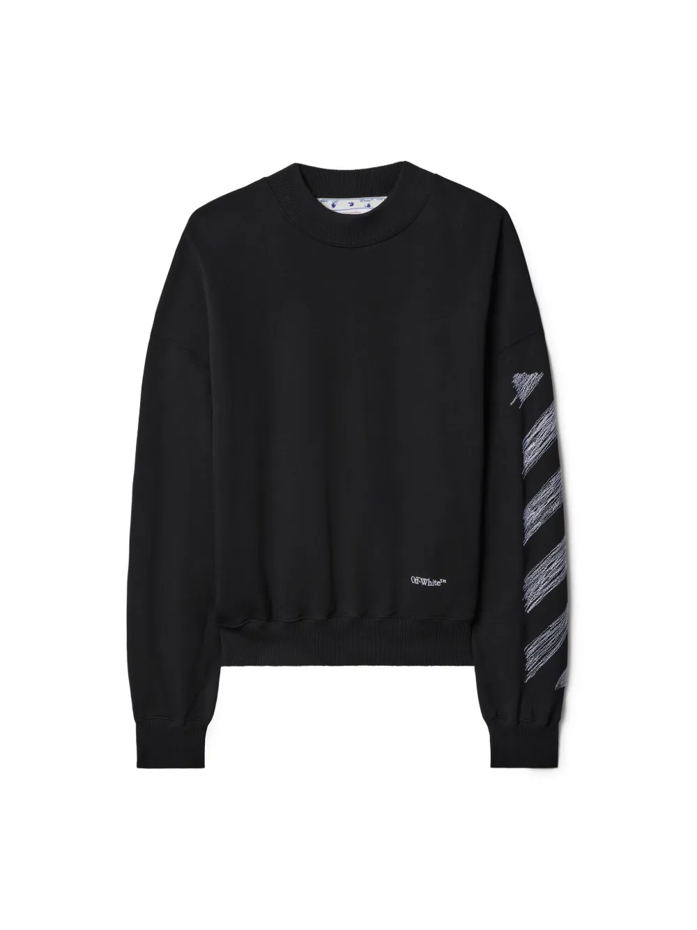 Black Long Sleeves Sweatshirt with White Off-White™ logo affront. Crewneck collar. White Painted Diagonal on one sleeve. WHITE script logo at back. Skate fit.