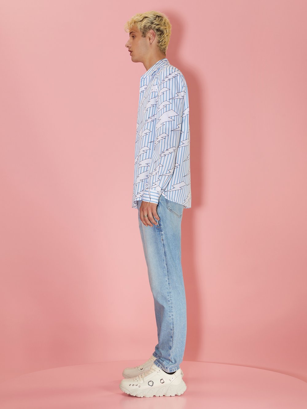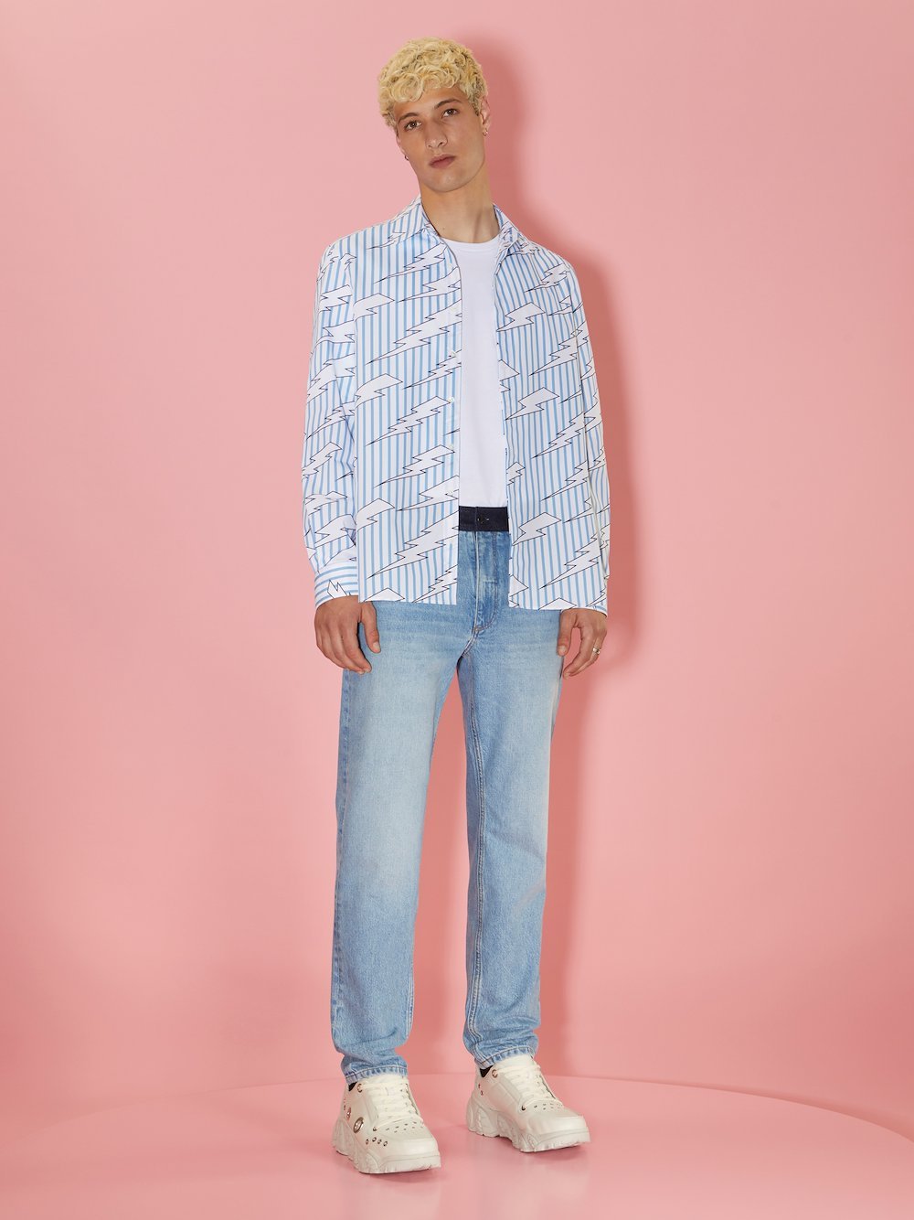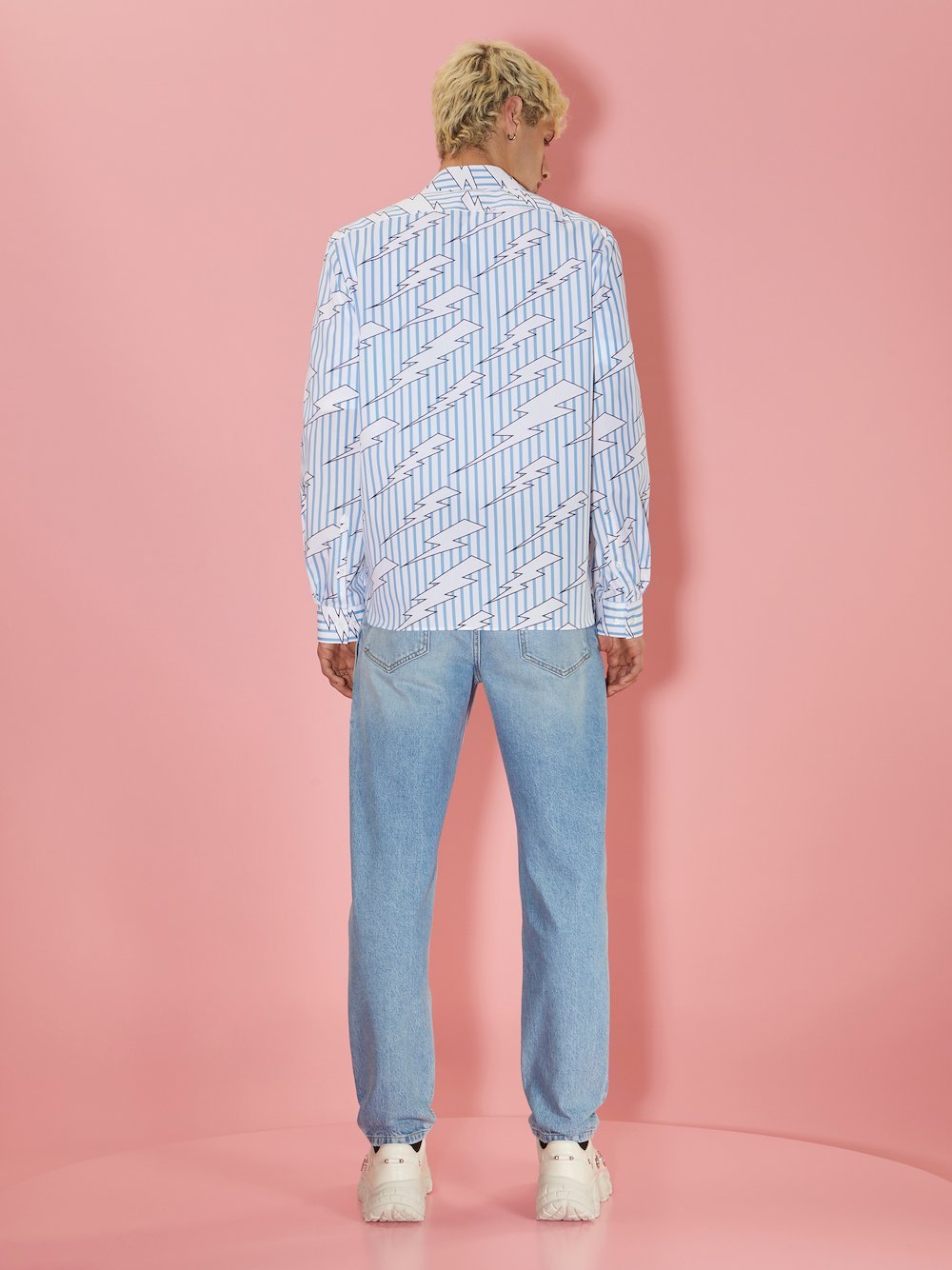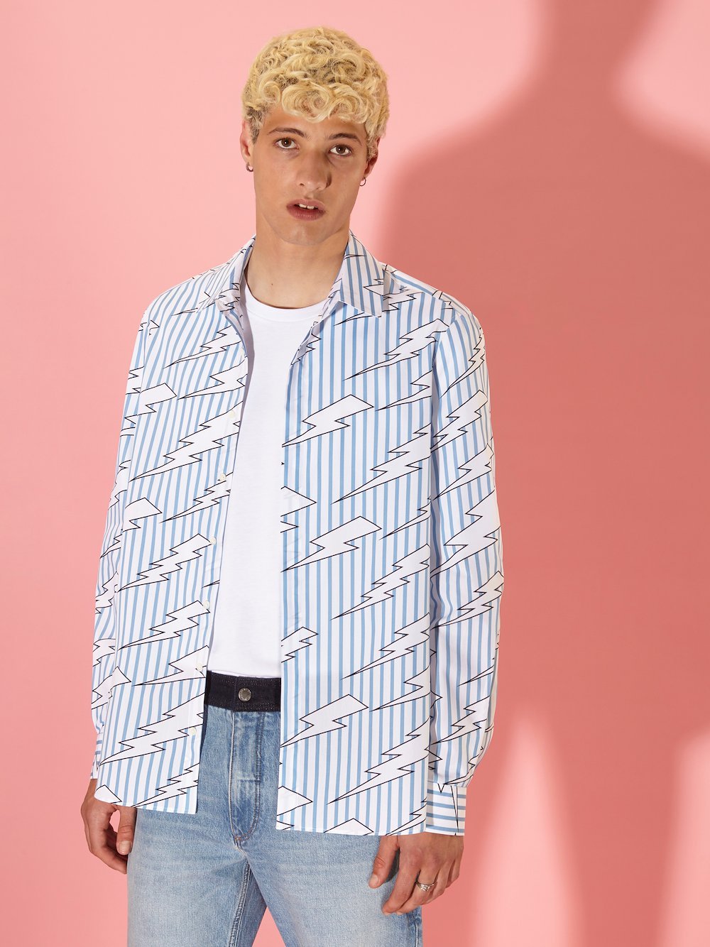 The classic stripes on this white and blue shirt combine with Neil Barrett’s “Raining Bolts”. It’s crafted in Italy from crisp cotton poplin to a Loose fit.